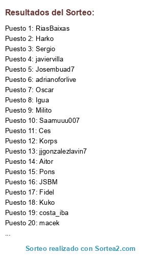 Lista de participantes: Milito, Pons, Oscar, JSBM, Ces, Joselu, Aitor, Josembuad7, Igua, Fran, Saamuuu007, Fidel, jjgonzalezlavin7, fernomad, macek, RiasBaixas, javiervilla, Harko, Martín, Sergio, Kuko, Korps, costa_iba, adrianoforlive.