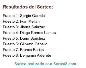 Lista de participantes: Jhona Salazar, Franco Farias, Sergio Garrido, Ivan Melian, Benjamin Alderete, Diego Ramos Lamas, Gilberto Cabello, Dario Sanchez.