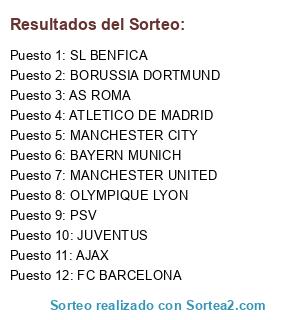 Lista de participantes: AJAX, MANCHESTER CITY, ATLETICO DE MADRID, BAYERN MUNICH, SL BENFICA, MANCHESTER UNITED, BORUSSIA DORTMUND, OLYMPIQUE LYON, FC BARCELONA, JUVENTUS, AS ROMA, PSV.
