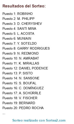 Lista de participantes: K. MIRALLAS, L. ACOSTA, D. CHERYSHEV, S. LARSSON, P. SISTO, GARRY RODRIGUES, DANIEL PODENCE, C. DOMÍNGUEZ, M. VALBUENA, S. BOUFAL, A. YOUNES, PEDRO ROCHA, Y. SOTELDO, N. AMRABAT, N. SANSONE, SANTI MINA, A. SCHÜRRLE, M. PHILIPP, ROBINHO, MUNIAIN, BERNARD, N. REDMOND, V. FISCHER.