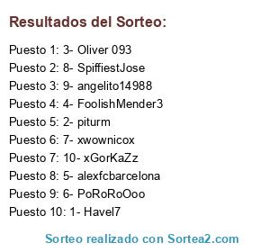 Lista de participantes: 1- Havel7, 2- piturm, 3- Oliver 093, 4- FoolishMender3, 5- alexfcbarcelona, 6- PoRoRoOoo, 7- xwownicox, 8- SpiffiestJose, 9- angelito14988, 10- xGorKaZz.