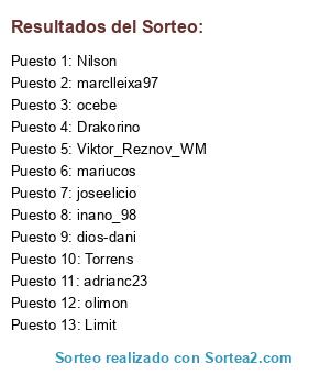 Lista de participantes: adrianc23, Nilson, Torrens, olimon, Limit, mariucos, inano_98, ocebe, joseelicio, marclleixa97, Viktor_Reznov_WM, dios-dani, Drakorino.