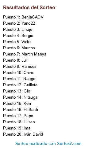 Lista de participantes: Kerr, Marcos, Ima, BenjaCAOV, Victor, Ramsés, Gio, Linaje, Iván David, Guillote, Juli, El Santi, Yano22, Martin Manya, Sergio, Ulises, Pepo, Nagga, Nitsuga.