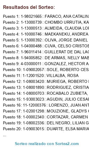 Lista de participantes: 1-97018845 TROSSERO, HUGO JOSE, 1-94006245 VAÑO, SANTIAGO PABLO, 1-99030233 LEPISKE, MARIO EDGARDO, 1-94003864 BETHANCOURT, RAMON ALBERTO, 1-99029474 DI TOMMASO, NEVIO, 1-97018887 TROSSERO, CRISTIAN HERNAN, 1-98021030 DE PABLO, FERNANDO MIGUEL, 1-93003023 AGUDIN, JULIO CESAR, 1-93003179 ANCASAY, ROBERTO OSCAR, 1-98024041 BALSAMO, MARIA TERESA, 1-96010282 BERGERO, ANA MARIA, 1-03001134 MARTINEZ, VIVIANA CLAUDIA, 1-93003005 AGUDIN, JULIO CESAR, 1-94006017 GAETE, MAXIMILIANO, 1-94004050 VAZQUEZ, LUIS FERNANDO, 1-97014030 MEJTER, KARINA, 1-94004714 HERRERA, MONICA ADRIANA, 1-04000265 OLIVERA, JORGE, 4-00000083 AGUILERA, LILIAN PATRICIA, 1-96011443 BENADIBA, ALCIRA BEATRIZ, 1-03000281 FAVRET, AUGUSTO MARCIAL, 4-97017074 CZAYA, FRANCISCO, 1-05002052 BALLESTEROS, GERVASIO VICENTE, 1-01001882 MIÑO, RICARDO, 1-97016011 URSUMARZO, SARA, 1-96009957 ALVAREZ, SILVANA EDITH, 1-09000231 ROJAS, MIRIAM ELIZABETH, 1-94005852 DE ARMAS, NELLY MABEL, 1-07000946 GANGARELLO, MIGUEL ALEJANDRO, 1-08001890 RODRIGUEZ, CRISTIAN ARIEL, 1-03000992 ARMESTO, JORGE, 1-97018376 LITWIN, ALFREDO IGNACIO, 1-98025342 CAVALLO, DIEGO OSCAR, 1-96010610 SANCHEZ, AMALIA GREGORIA, 1-08000383 GOMEZ, JULIA HAYDEE, 1-98024903 DAMUS, MARCELA NORA, 1-04001763 ANTONINI, LILIAN, 1-98021665 FARACO, ANA CATALINA, 5-02000013 GAMBOA, ELBIO DANIEL, 1-07000720 AMAYA, LAURA ELIZABETH, 1-96011414 GUILLERAT DE DAL LAGO, HELVECIA, 1-96011773 PIQUE, ELBA SUSANA, 1-05000945 ALIFRACO, JOSE, 1-97016154 GUIDA, ELENA CRISTINA, 1-08001258 IGLESIAS SANCHEZ, MIRIAM LAURA, 1-04000934 LOOSE, ALBINA RAQUEL, 1-98025563 MALETTA DE JAIMES, FLORISA, 1-07001790 DE SOUSA, ALICIA, 1-97018396 IVANICKI, ANA, 1-04000465 LASTRA, ANALIA, 1-07000193 ALEM, CARLOS, 1-00002340 CORTAZAR, CARMEN, 4-03000184 GUIDOLI, MIRTA ROSA, 1-00002667 MENOYO, ANIBAL NESTOR, 1-04000196 LOMBARDO, VICENTE, 1-06001486 VAÑO, PABLO NATANAEL, 1-03000789 FERRICCIONI, ALEJANDRO JORGE, 12-11000092 BRIONES, SILVIA CARINA, 4-97018657 LOZANO, SERGIO, 1-00002996 PERMUY DE PUENTE, ALICIA BEATRIZ, 1-97018591 CARDINALI, IRIDE, 1-99029527 BRITEZ, VICTORINA, 4-03000011 GONZALEZ, HECTOR ABEL, 1-05001163 MASRY, LILIANA NOEMI, 1-08000420 RANIERI, VALERIA FABIANA, 1-02000904 CHIQUILITO, RUBEN DANIEL, 1-98022383 CAVICHIOLI, FERNANDEZ CATIA, 4-98024226 VERGARA, TITA ZUNILDA, 1-97015428 VAQUERA DE VONO, JUANA ROSA, 1-00001534 FIGUEROA, MARTINA MAGDALENA, 1-97017148 FERNANDEZ, JORGE ALBERTO, 1-04000486 SERNA DE VEGA, MARIA ESTHER, 1-10000526 BASSI, HUGO OSCAR, 1-98025006 CURIA, MONICA PATRICIA, 1-98022935 FACIANO, ADRIANA CLAUDIA, 1-06001031 ORTIZ, CLAUDIA PATRICIA, 1-94006523 ARDILES, SOLEDAD BEATRIZ, 1-05002095 GIULIANO, JUAN CARLOS, 11-10000411 GONZALEZ MENDOZA, SALVADORA, 1-04000200 OJEDA, MARTA ANGELICA, 1-94006283 SPELGE, OTTO GUALBERTO, 4-06000110 GONZALEZ, MARIA CECILIA, 1-07000960 TRIPALDI, DANIEL CLAUDIO, 1-06000067 GOMEZ, GRACIELA NORMA, 1-07000943 BENITEZ, TRINIDAD ANA MARIA, 1-95007120 PURRALEF JEREZ, ALONSO ENRIQUE, 1-09002706 ANDRADE, ANGEL FABIAN, 4-03000150 CEBRIAN, SUSANA, 1-98020400 GARCIA, GRACIELA, 51-06000144 BAHAMONDE, DAMARIS NOEMI, 1-04000364 SUAREZ, FILOMENA, 1-09002917 MORENO, DANIEL JOSE, 1-94005889 GONZALEZ, JULIA MERCEDES, 1-02000851 STRANGIS, CLAUDIA SILVANA, 1-06002404 GONZALEZ, JACINTA, 1-08003420 MURIEGA, ROBERTO LORENZO, 1-94006346 ASTUDILLO, MIRTA OFELIA, 1-11000825 PORTALE, LILIANA MIRIAM, 1-08001521 MEDINA, ELVIO LEOPOLDO, 1-04000201 BAREA, CLAUDIA MABEL, 1-98020455 PUGLIESE, ELENA ALICIA, 1-03000398 SARUBBI, MARTA, 1-99026495 ESCOBAR, DORALISA, 1-08002047 CORDOBA, RAQUEL, 1-08002942 TREJO, SABRINA ELIANA, 1-99026793 GOENAGA, ATILIO EUGENIO, 1-99028075 VALLEJOS, LIDIA, 1-09000573 LOMBARDO, GABRIELA, 1-07000790 SIAN, SUSANA LEONOR, 1-08001221 OLLER, JOSE LUIS, 1-08003755 TACHELA, JULIO CESAR, 1-05000039 DONDENI, SILVINA EDITH, 1-03000370 CHEREY, ROSA STELLA MARIS, 1-95009126 D'AGATI, MABEL, 1-99029337 BERTA DE CAPELLI, ETHEL MARY, 11-11000447 BUSTAMANTE, OSCAR ANTONIO, 4-09000604 TROSSERO, ORNELLA, 1-99029032 CASABURO, CLAUDIA ALEJANDRA, 1-03000522 OPAZO, CARMEN, 1-09001811 PUZZOLO, MELINA, 1-95006811 FUSTER, JOAQUIN RICARDO, 1-08003304 HUT, ESTELA MERCEDES, 1-09000008 PEREZ, PATRICIA HAYDEE, 1-04001759 SEPULVEDA, MARIA ESTER, 1-09002591 REICHEL, ESTER YOLANDA, 1-07002214 ANTOLIN, ANDREA LAURA, 1-03001234 CUTURIES, ADRIANA ISABEL, 1-97017077 BEVACQUA, MARIA ESTER, 1-94003735 LAUDONIA, JUAN CARLOS ROQUE, 1-09002918 RODRIGUEZ, JUAN BAUTISTA, 1-06002428 DOMINI, LUCIA HILDA, 1-07001853 PEREYRA, NELLY GLADYS, 1-03000251 LEPISKE, GERARDO, 1-06002343 VITALE, ROSANA HEBE, 1-02001266 RUIZ DIAZ, OSCAR ERNESTO, 1-09000541 TOURNIER, ANALIA MODESTA, 1-99029259 ORFANO, SANTA, 1-95009144 GANDOLLA, ZULEMA, 10-13000020 MAIDANA, LIDIA ESTHER, 11-11000379 GARCIA VOLPI, KARINA FERNANDA, 1-09000473 ALBORNOZ, HERNANDO, 1-09000265 DE PEON, WALTER OMAR, 1-09003172 GUERRERO, LIDIA MABEL, 1-12001703 BARRIOS, FLAVIA SOLEDAD, 1-04000624 MELLUSO, LILIANA ANTONIA, 1-00002646 RECASENS, ANTONIA BEATRIZ, 1-95008619 VILLANUEVA, MERCEDES MIRTA, 51-04000025 ELIAS, JORGE LUIS, 1-08001362 TULLIO, CARLOS ALBERTO, 1-96013152 SALERNO DE ACCIARRI, ANA MARIA, 1-09003156 ANANIA, PABLO JAVIER, 1-07000957 DECIANNI, MARIA, 1-10001044 ORELLANO ROSALES, FORTUNATA MARCELINA, 1-08001720 ALVAREZ, CARLOS JACINTO, 1-10001961 ALVARO, MARIA ELENA, 1-09000267 SCAPICCHIO, LILIANA ALEJANDRA, 1-08001318 DEL PIZZO, MARIA CRISTINA, 1-05000653 RUIZ, PABLO ARIEL, 1-99027689 BIGOLIN, LIDIA SILVIA, 1-06001488 CORONEL, MARIA ESTELA, 1-11000254 SCARZELLO, NESTOR ALDO, 4-09000116 RODRIGUEZ, EUGENIA VERONICA, 1-09000753 PRIETO, MARIA CONCEPCION, 1-08001114 MALDONADO, LILIA GRACIELA, 1-99030075 PERUZZETTO, RICARDO, 1-06000973 GRADOS RUIZ, ESPERANZA, 1-08003198 PEREZ, MARINA SANDRA, 6-07000030 CHRIPCZUK KORNICHUK, MIGUEL, 11-10000248 MOSCA, MARIA, 4-07000069 NERI, RAUL SEBASTIAN, 1-08003543 STEMPELS, MARIA EUGENIA, 4-07000403 RUEDA, SILVIA ESTELA, 1-02000716 VATTIMO, TERESA, 1-08002745 ALFANO, MIGUEL ANGEL, 1-08000608 CABRE