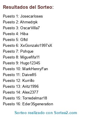 Lista de participantes: Aritz1996, Daive85, Kurrillo, Hugo12345, Ahmedrpk, XxGonzalo1997xX, Miguefifa11, Torredelmar18, Pohque, Hiba, MarkHenryFan, Alex2377, Gftd, Josecarloses, Eder35generation, OscarVilla7.