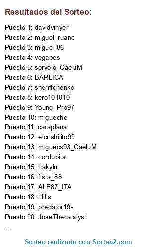 Lista de participantes: RubensFCB, amortee, selinichev, DaniRCBaraka, elcrishiiito99, sorvolo_CaeluM, farbax, vidalsergi, sheriffchenko, danii_sniper8, VAMOS_VICENT, vincent-dip, sfizio_barone85, ALE87_ITA, Lakylu, ekoh, Juan_angel10, AdriOrtiz99, abforz, kaseO_crew_, jesure9, cortex_xx, cordubita, Jerbaman2, Fer_Don3p, X-peridtj-X, mateocamisa10, Menika91, Menika, tililis, kaiser-SH7, boixos_nois186, Dami_almenara, agustainer, BARLICA, pablogar06, Jorgelm7_CaeluM, kamisama_1095, D4v1d_f3n1x, intocable1986, ertortas86, hackapell_, RiWiVi, comohuelo, enrimabe07, RZGamer8, pelusso55, jerasxs, f4r4On1988, caraplana, pes_lolito, lincedeo_86, anquiher, ADuMat_6, golin82, kero101010, angelete_7, cipotti, valle__17, rubenmartin10, antonioperezSFC, joselito3489, miguel_ruano, baena_betis, elcheri81, ik791, DaNyLoKo, something, migueche, Alex5000_kruji, fista_88, juanma641990, miguecs93_CaeluM, Ddani82, soccatala73, maskirojillo, pablocusan, kefergas, carly777, roqueluis, Luis_22, predator19-, vegapes, juanmi_cordoba, soto___11, troyanitooo999, jliyo, agresivo100, gazkezjr, peperecre1987, "fantástico-1 "José", PESD10S, vanvicen14, Domenikong, limbergAVM, lord-perez7, JoseThecatalyst, messi-jerezano, Guille_Im, ivanrojasru30, jaimeig, Jpf-2009, promures_joaquin, killote21, sr_mandanga00, juanjosecuenca, twisterswar, migue_86, G66physis666, tollochipiona, Abrahamm0726, isra_almansa, pacoeste, rafuka_666, mageto_CaeluM, davidyinyer, coyu8, Alberkin, tachin_6, Xavx30, radun99, baricelli, rodrigoroig, cheche19, cases_89, Young_Pro97, Joipas, Ilraiss_85.