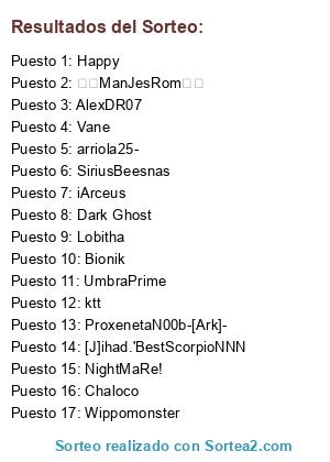 Lista de participantes: NightMaRe!, iArceus, Vane, Ryuu_xD, Lobitha, [J]ihad.'BestScorpioNNN, ktt, Chaloco, Happy, ★☚ManJesRom☛★, Nilson, UmbraPrime, Pls End your Fucking life c:, SiriusBeesnas, AlexDR07, Bionik, ProxenetaN00b-[Ark]-, z1ber, Dark Ghost, Wippomonster, erick_far, arriola25-.