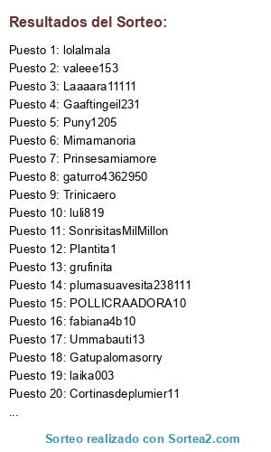 Lista de participantes: navidad2006, Trinicaero, glendaM, Prinsesamiamore, xmoster, laika003, Plantita1, valeee153, Ummabauti13, Amigaturi, gaturro4362950, POLLICRAADORA10, lolalmala, Puny1205, grufinita, fabiana4b10, luli819, mundo de domi, TutosIrinastico, Marcos de puer, Daarka, SonrisitasMilMillon, Gatupalomasorry, Cortinasdeplumier11, UmiKawaiiisita, Laaaara11111, Gaaftingeil231, Mariinatikawaii245, plumasuavesita238111, Candesitarochii20, H0l4s01g3rm4n4444, Lelelekawaiii634, Narniaokno00, soykawaii327, Mimamanoria, S0R3TE44444.
