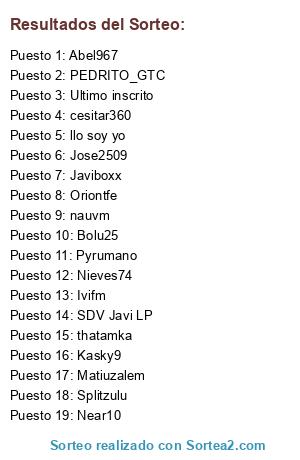Lista de participantes: Splitzulu, Jose2509, Pyrumano, Bolu25, SDV Javi LP, Nieves74, Oriontfe, Near10, Kasky9, thatamka, Ivifm, PEDRITO_GTC, Javiboxx, llo soy yo, cesitar360, nauvm, Abel967, Matiuzalem, Ultimo inscrito.