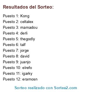 Lista de participantes: juanjo, igarky, thegodly, derli, jorge, david, celtalex, talf, Kong, elrefo, eramosn, mamadou.