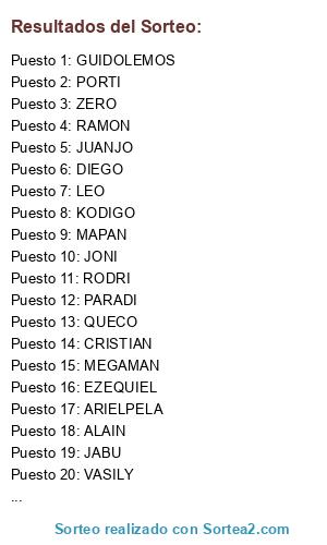 Lista de participantes: JUANJO, RAMON, PORTI, QUECO, JONI, MAPAN, ARIEL, CRISTIAN, ELPELADO, VASILY, RODRI, ALAIN, SAMU, ZERO, MEGAMAN, TOTO, SANTIBOG, DIEGO, PARADI, ARIELPELA, GUIDO, GUIDOLEMOS, LEO, JABU, KODIGO, EZEQUIEL, PABLOCAVS.