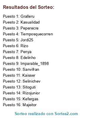 Lista de participantes: Majeitor, Sanvifran, Selinichev, Tiemposquecorren, Jordi25, Penya, Kaisser, Kasualidad, Imparable_1898, Kefergas, Edelinho, Gralleru, Peperecre, Rizo, Rizojunior, Sitoguti.