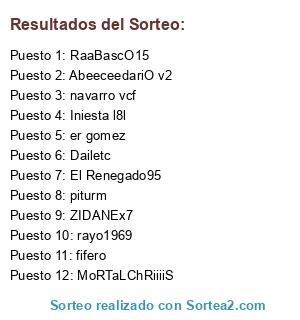 Lista de participantes: MoRTaLChRiiiiS, ZIDANEx7, navarro vcf, El Renegado95, Dailetc, RaaBascO15, Iniesta l8l, AbeeceedariO v2, piturm, fifero, rayo1969, er gomez.
