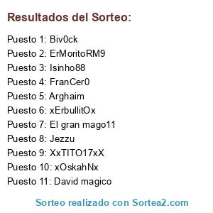 Lista de participantes: FranCer0, El gran mago11, Jezzu, Arghaim, Biv0ck, David magico, Isinho88, ErMoritoRM9, xOskahNx, xErbullitOx, XxTITO17xX.