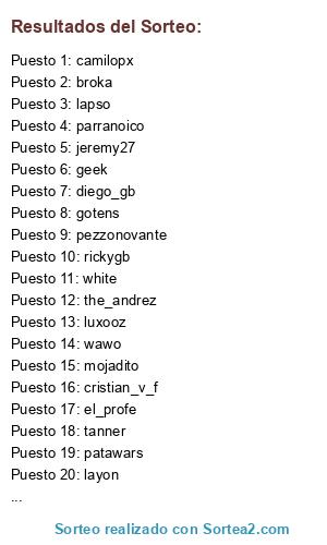 Lista de participantes: Carlos DF, Ch4p4, David5489, Eternal Freddy, Getsemani, HectorMendoza, Icoltus05, Jaaiimee, Komun3ro, Mariorob7, Marvl03, MERCENARIO UNAM, Obed 10, PabloVerguero, Rafri, Raul2417, Rockf22, Shevaoscar7, SplendidSubset9, Zlatko Z.