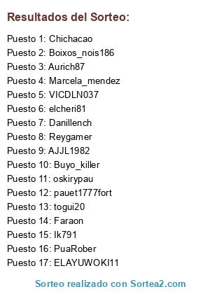 Lista de participantes: Faraon, Boixos_nois186, Reygamer, Ik791, AJJL1982, Aurich87, Danillench, VICDLN037, Marcela_mendez, oskirypau, elcheri81, PuaRober, ELAYUWOKI11, togui20, Buyo_killer, Chichacao, pauet1777fort.