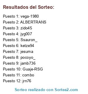Lista de participantes: Ssauron_, ketze94, Guaje-RSG, pocoyo_, jrn76, jyg007, combo, jesuma, vega-1980, jamb736, zido45, ALBERTRANS.