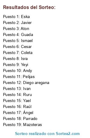 Lista de participantes: Eska, Javier, Isra, Raúl, Andy, Cesar, Ivan, Guada, Mazoteras, Ángel, Yael, Aton, Coleta, Pelijas, Parrado, Ismael, Ruru, Diego aregana, Yeyi.