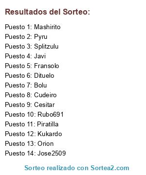 Lista de participantes: Jose2509, Dituelo, Piratilla, Cudeiro, Bolu, Pyru, Fransolo, Cesitar, Kukardo, Splitzulu, Mashirito, Rubo691, Orion, Javi.