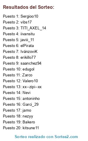 Lista de participantes: javiii_11, elPirata, IvánzoviK, jamo, Bakero, Sergioo10, iivansitu, saanchez94, xx--zipi--xx, kitsune11, TITI_AXEL_14, Garci_29, Nevi, nezyy, edugol, antoninho, Valero10, vibs17, erikillo77, Zarco.