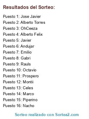 Lista de participantes: Prospero, Nacho, Marco, Emilio, Jose Javier, Alberto Torres, Octavio, Piperino, Rauls, Gabri, Celes, Montii, OhCeeza, Andujar, Alberto Felix, Javier.