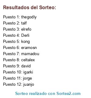 Lista de participantes: eramosn, mamadou, thegodly, juanjo, jorge, igarki, david, elrefo, talf, celtalex, kong, Derli.