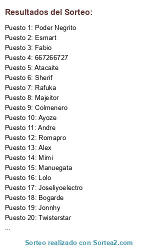 Lista de participantes: Sherif, Esmart, Joseliyoelectro, Alex, Bogarde, Colmenero, Jonnhy, Juaki, Lolo, Majeitor, Manuegata, Mimi, Twisterstar, 667266727, Poder Negrito, Rafamunt, Romapro, Fabio, Ayoze, Andre, Atacaite, Rafuka, Makaroov69, Sergio.