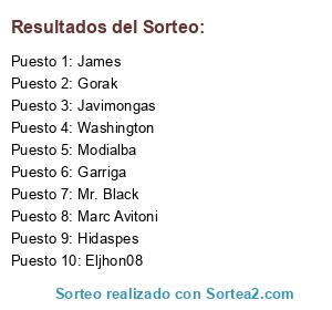Lista de participantes: Garriga, Hidaspes, Marc Avitoni, James, Javimongas, Washington, Gorak, Modialba, Mr. Black, Eljhon08.