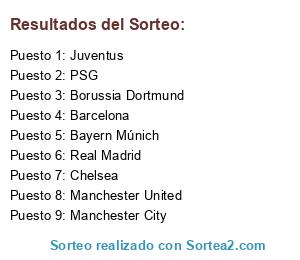 Lista de participantes: Barcelona, Real Madrid, Manchester City, Manchester United, Borussia Dortmund, Juventus, Bayern Múnich, Chelsea, PSG.