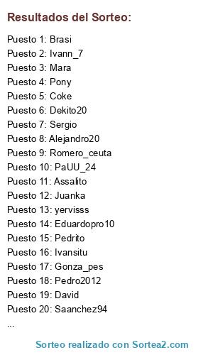 Lista de participantes: Kagaxin, yervisss, David, Pedro2012, Gonza_pes, Ivansitu, Sergio, Mara, Bit, Assalito, Coke, Alejandro20, Saanchez94, Josehr, Romero_ceuta, Pony, Meida11, PaUU_24, Ivann_7, Eduardopro10, Pedrito, Brasi, Juanka, Dekito20.