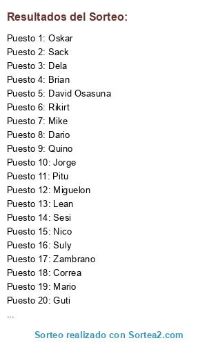 Lista de participantes: Mike, Dela, Rikirt, Mario, Sesi, Alberto, Brian, Jorge, Sack, Oskar, Miguelon, David Osasuna, Dario, Quino, Pitu, Zambrano, Correa, Suly, Guti, Nico, Mangel, Jonathan, Lean, Edu.