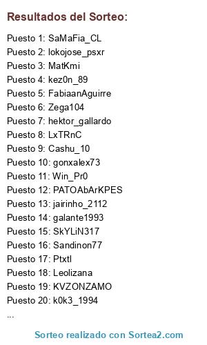 Lista de participantes: kez0n_89, FabiaanAguirre, XunXoOThebesT, jairinho_2112, LxTRnC, KVZONZAMO, SkYLiN317, hektor_gallardo, k0k3_1994, PATOAbArKPES, SaMaFia_CL, Zega104, galante1993, MatKmi, Win_Pr0, Cashu_10, Sandinon77, lokojose_psxr gonxalex73, Garcia0227, Ptxtl, Leolizana..