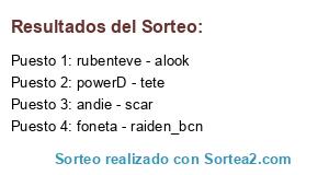 Lista de participantes: andie - scar, rubenteve - alook, powerD - tete, foneta - raiden_bcn.