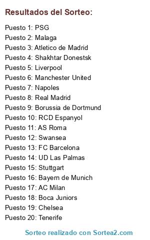 Lista de participantes: Borussia de Dortmund, Manchester United, Shakhtar Donestsk, Real Madrid, Chelsea, FC Barcelona, Tenerife, Bayern de Munich, AS Roma, Swansea, Malaga, Boca Juniors, UD Las Palmas, Atletico de Madrid, Napoles, AC Milan, PSG, Liverpool, RCD Espanyol, Stuttgart.