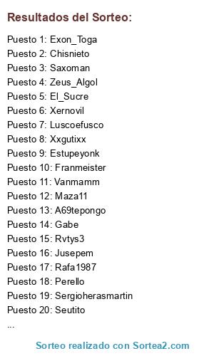 Lista de participantes: Vanmamm, Marpe007, Maza11, Perello, Xernovil, Chisnieto, Rvtys3, Andoni, Xxgutixx, Javiergarcia7, Juanma_10, Zenitramm, Luscoefusco, Tarzandelpro, Exon_Toga, Zeus_Algol, Lionheart, Sergioherasmartin, Siboga, Jusepem, Estupeyonk, Seutito, Lenders, Gorri7, Davies19951995, El_Sucre, A69tepongo, Esancho, Jparram, Gabe, Betikozel, Franmeister, Galesberdurin, Rafa1987, Zanarkanz, Saxoman.