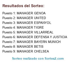 Lista de participantes: MANAGER GENOA, MANAGER TIGRE, MANAGER BAYERN MUNICH, MANAGER DEFENSA Y JUSTICIA, MANAGER CHELSEA, MANAGER VILLARREAL, MANAGER ESPANYOL, MANAGER BETIS, MANAGER UNITED.