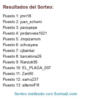 Lista de participantes: EL_PLAGA_007, jordanvera1021, altemirFR, juan_schumi, samu237, cjbankai, jmrr18, Jmpizarrom, pacopepe, Zen90, barcelona26, Ranzok95, schusyera.