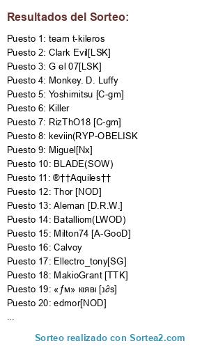Lista de participantes: [Pr0] Killer, -Pr0- John Smit, Calvoy NX, [Pr0] Hypnos, G el 07[LSK], RizThO18 [C-gm], Clark Evil[LSK], [[Gods Army]] Dark Master.