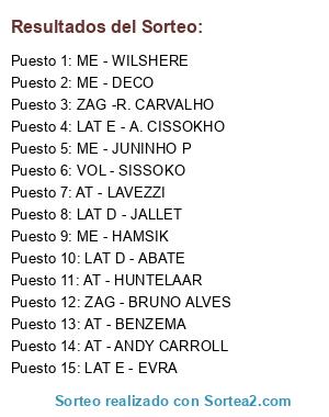 Lista de participantes: AT - ANDY CARROLL, AT - HUNTELAAR, LAT D - ABATE, LAT D - JALLET, LAT E - A. CISSOKHO, LAT E - EVRA, ZAG - BRUNO ALVES , ZAG -R. CARVALHO, VOL - SISSOKO, ME - DECO, ME - HAMSIK, ME - WILSHERE, ME - JUNINHO P, AT - LAVEZZI , AT - BENZEMA , .