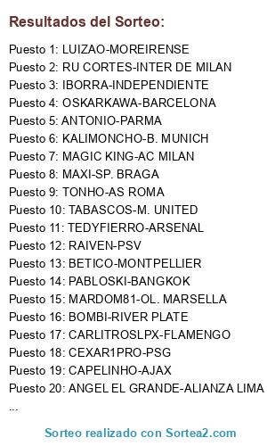 Lista de participantes: AMONOSPAREXXX-JUVENTUS, ANGEL EL GRANDE-ALIANZA LIMA, ANTONIO-PARMA, BETICO-MONTPELLIER, BOMBI-RIVER PLATE, BUSTILLO-GALATASARAY, CAPELINHO-AJAX, CARLITROSLPX-FLAMENGO, CESARITO-GIRONDINS, CEXAR1PRO-PSG, CUERVO-SAMPDORIA, IBORRA-INDEPENDIENTE, JOSE6912-ANDERLECHT, J. SEGO-MONACO, KALIMONCHO-B. MUNICH, LUIZAO-MOREIRENSE, MAGIC KING-AC MILAN, MARDOM81-OL. MARSELLA, MAXI-SP. BRAGA, OSDOBLA-OL. LYON, OSKARKAWA-BARCELONA, PABLOSKI-BANGKOK, PADRONE-LILLE, RAIVEN-PSV, ROKO-BOCA JUNIORS, RU CORTES-INTER DE MILAN, SENTENZA-PALESTINO, SULLENDONKEY-LAZIO, TABASCOS-M. UNITED, TEDYFIERRO-ARSENAL, TITI HENRRY-CELTIC, TONHO-AS ROMA.