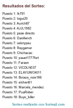 Lista de participantes: Faraon, Boixos_nois186, Reygamer, Ik791, AJJL1982, Aurich87, Danillench, VICDLN037, Marcela_mendez, oskirypau, elcheri81, PuaRober, ELAYUWOKI11, togui20, Buyo_killer, Chichacao, pauet1777fort, pase directo.
