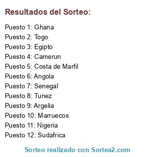 Lista de participantes: Costa de Marfil, Ghana, Argelia, Nigeria, Tunez, Sudafrica, Egipto, Marruecos, Camerun, Senegal, Angola, Togo.