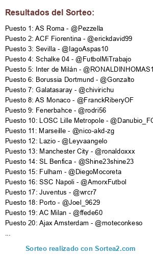 Lista de participantes: FC Barcelona - @TrollMaan, Real Madrid CF - @FerrCarp, Atletico de Madrid - @BobbyLashley, Valencia CF - @Walmach, Sevilla - @IagoAspas10, Manchester United - @FranSLA, Manchester City - @ronaldoxxx, Chelsea - @MbocaB, Arsenal - @WWERevolution96, Tottenham Hotspur - @Niiqo_GodoyCruz, Fulham - @DiegoMocoreta, Liverpool - @milani2001, Juventus - @wrcr7, AC Milan - @ffede60, Inter de Milán - @RONALDINHOMAS10, AS Roma - @Pezzella, SSC Napoli - @AmorxFutbol, Lazio - @Leyvaangelo, ACF Fiorentina - @erickdavid99, PSG - @Brako-CJA, Marseille - @nico-akd-zg, Lyonnais - @Morrison142, AS Monaco - @FranckRiberyOF, LOSC Lille Metropole - @Danubio_FC, Bayern Munich - @Aguss_98, Borussia Dortmund - @Gonzalto, Schalke 04 - @FutbolMiTrabajo, Galatasaray - @chivirichu, Fenerbahce - @rodri56, Porto - @Joel_9629, SL Benfica - @Shine23shine23, Ajax Amsterdam - @moteconkeso.