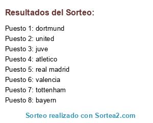 Lista de participantes: valencia, juve, real madrid, tottenham, atletico, bayern, dortmund, united.
