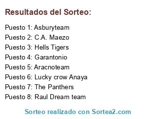 Lista de participantes: Lucky crow Anaya, The Panthers, Asburyteam, Hells Tigers, Garantonio, Raul Dream team, Aracnoteam, C.A. Maezo.