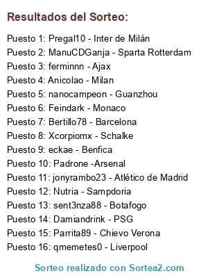 Lista de participantes: Padrone -Arsenal, qmemetes0 - Liverpool, Nutria - Sampdoria, sent3nza88 - Botafogo, Parrita89 - Chievo Verona, Feindark - Monaco, jonyrambo23 - Atlético de Madrid, Damiandrink - PSG, ferminnn - Ajax, nanocampeon - Guanzhou, Pregal10 - Inter de Milán, Bertillo78 - Barcelona, Anicolao - Milan, eckae - Benfica, Xcorpiomx - Schalke, ManuCDGanja - Sparta Rotterdam.