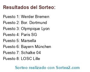 Lista de participantes: Bayern München, Bor. Dortmund, LOSC Lille, Marsella, Olympique Lyon, Paris SG, Schalke 04, Werder Bremen.