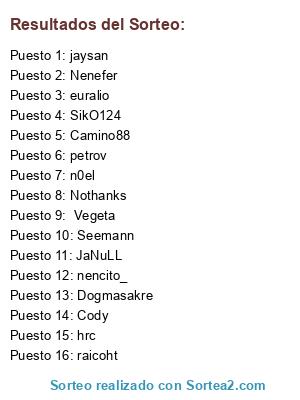 Lista de participantes: Vegeta, Cody, Statham, Hector836, DjMummy, camino88, SikO124, Niklas, jwanes, nencito_, hrc, jaysan, Wokooo, Benzemen, euralio, raicoht.