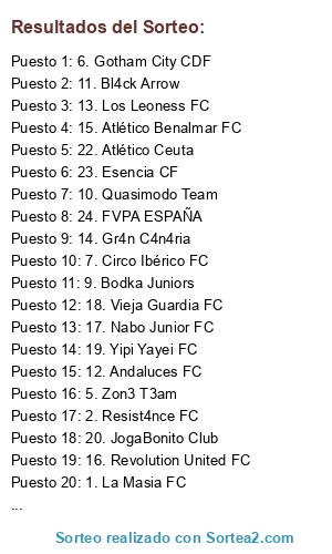 Lista de participantes: 1. La Masia FC, 2. Resist4nce FC, 3. Atlético de Bar, 4. Cruzcampo FC, 5. Zon3 T3am, 6. Gotham City CDF, 7. Circo Ibérico FC, 8. Old Dogs Gaming, 9. Bodka Juniors, 10. Quasimodo Team, 11. Bl4ck Arrow, 12. Andaluces FC, 13. Los Leoness FC, 14. Gr4n C4n4ria, 15. Atlético Benalmar FC, 16. Revolution United FC, 17. Nabo Junior FC, 18. Vieja Guardia FC, 19. Yipi Yayei FC, 20. JogaBonito Club, 21. Real Betis Fifa, 22. Atlético Ceuta, 23. Esencia CF, 24. FVPA ESPAÑA.