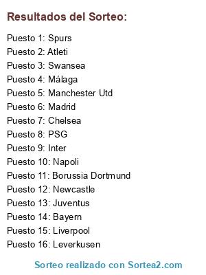 Lista de participantes: Borussia Dortmund, Madrid, Chelsea, Juventus, Napoli, Málaga, Leverkusen, PSG, Liverpool, Spurs, Inter, Swansea, Bayern, Manchester Utd, Newcastle, Atleti.